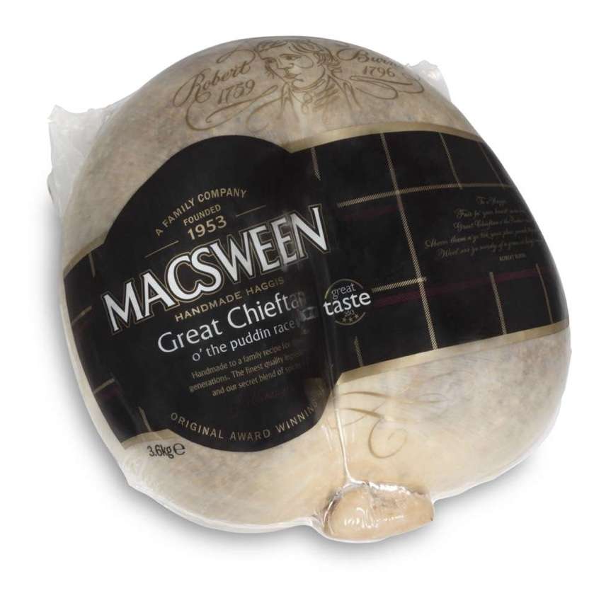MacSweens` Chieftan Haggis ist ein echter Hingucker und wird bei jedem Schottischen Dinner oder Whisky Tasting die Gäste nicht nur kulinarisch überzeugen. Das vorgekochte Haggis wird in Naturdarm aufwendig geformt um den klassischen Chieftan-Look zu erreichen. Der Haggis muss lediglich erhitzt werden und wird traditionell am besten mit Kartoffelpüree und Steckrüben serviert; somit erhält man das perfekte Schottische Dinner. 3,68 kg, für 16-18 Personen